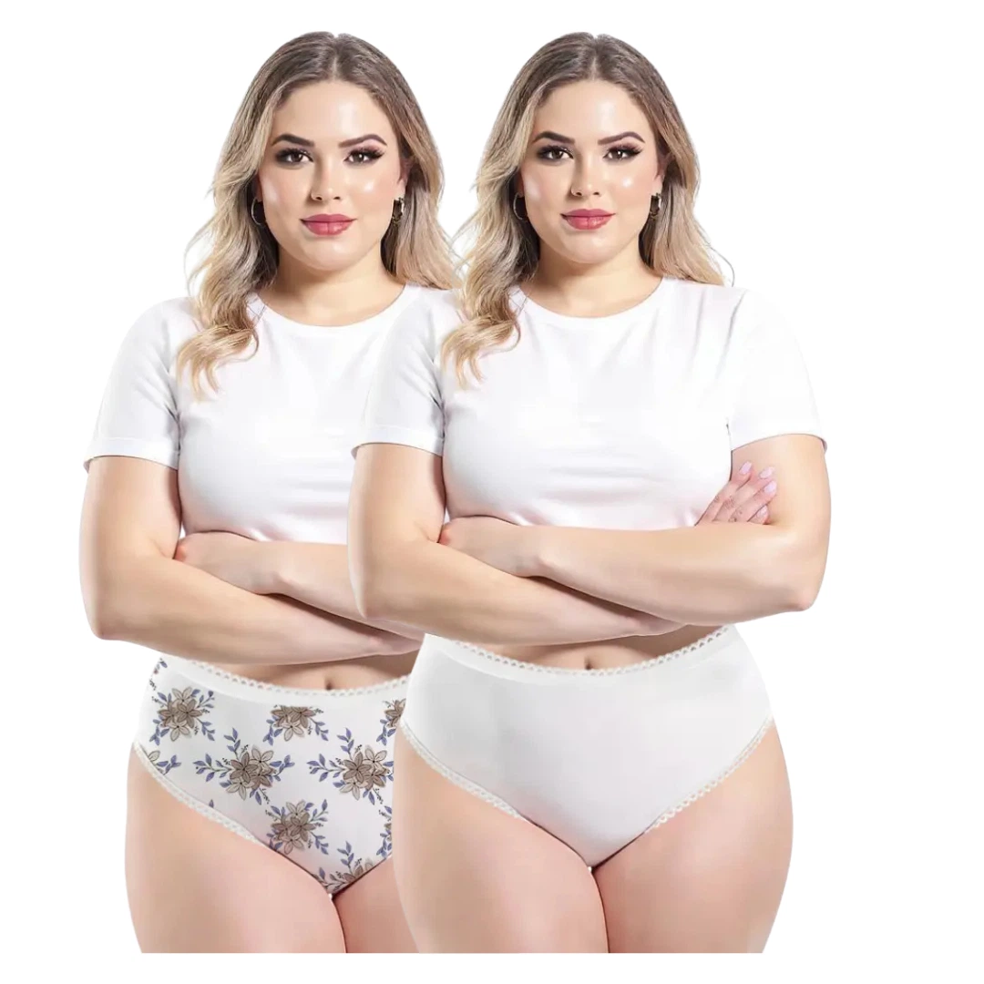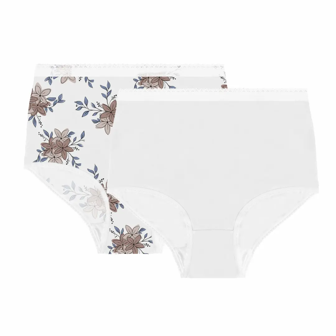 Zestaw dwóch par fig damskich o wysokim stanie – idealne połączenie wygody i kobiecego wyglądu. Jedna para klasyczna biała, druga z delikatnym kwiatowym nadrukiem w odcieniach brązu i niebieskiego. Miękka, oddychająca bawełna gwarantuje komfort przez cały dzień, a subtelna koronka na wykończeniach dodaje uroku.