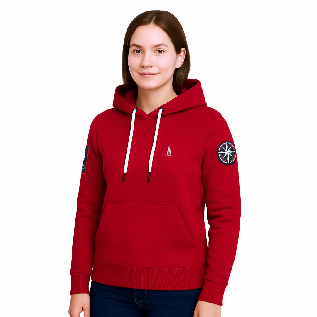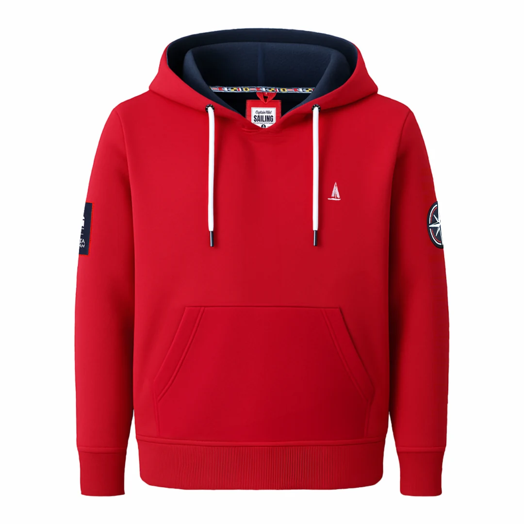Wykonana z miękkiej, oddychającej bawełny tureckiej z dodatkiem poliestru, doskonale sprawdzi się zarówno na chłodniejszych rejsach, jak i podczas wieczornego relaksu w marinie. Praktyczna kieszeń typu kangurka ogrzeje dłonie po zejściu z pokładu, a regulowany kaptur ochroni przed nagłym podmuchem wiatru. Intensywny czerwony kolor nawiązuje do barw sygnałowych, a subtelne detale z motywami żeglarskimi podkreślają Twój morski charakter.