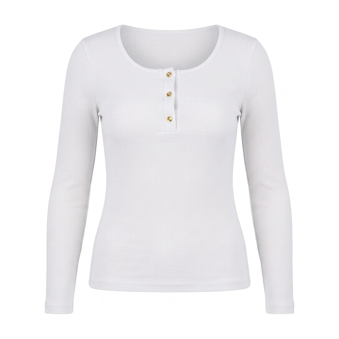 Dopasowana biała bluzka damska o prążkowanej strukturze z długim rękawem i ozdobnym zapięciem na guziki. Wygodny model basic, który dobrze układa się na sylwetce i świetnie pasuje do codziennych stylizacji. Wykonana z wysokiej jakości bawełny tureckiej, łączy komfort noszenia z klasycznym, kobiecym wyglądem.