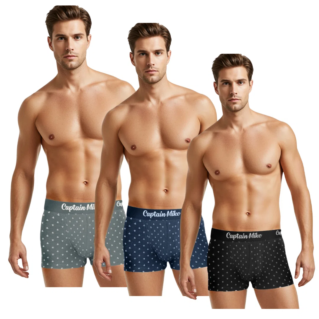 Trójpak męskich bokserek Captain Mike® to komfort, styl i marynistyczny charakter w jednym. Miękka bawełna z elastanem gwarantuje idealne dopasowanie i wygodę przez cały dzień, a motyw kotwicy dodaje im unikalnego żeglarskiego stylu. To bielizna, która łączy trwałość z nowoczesnym designem.