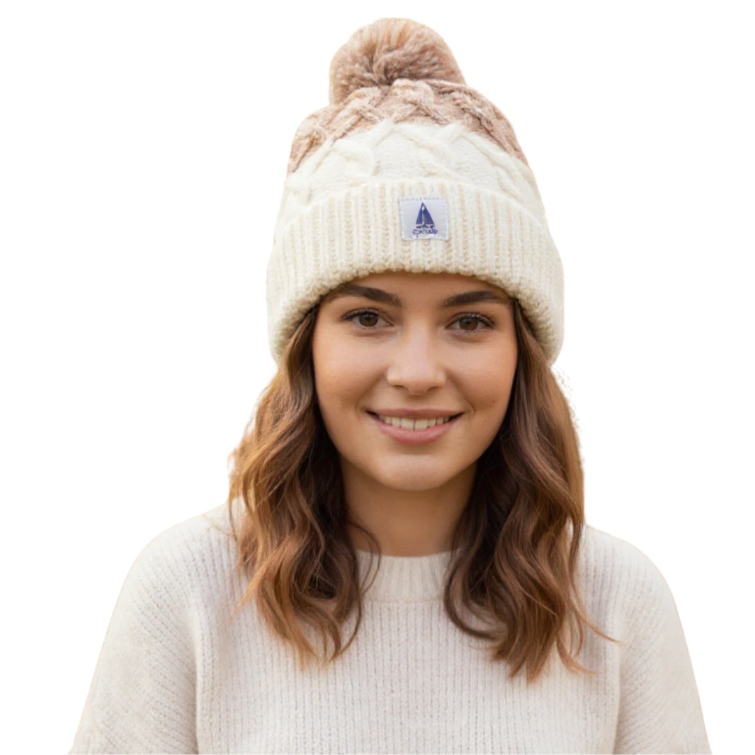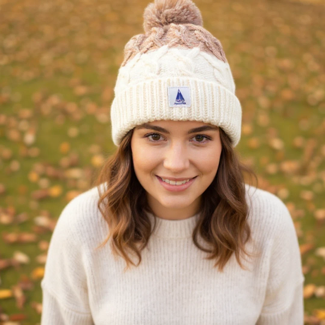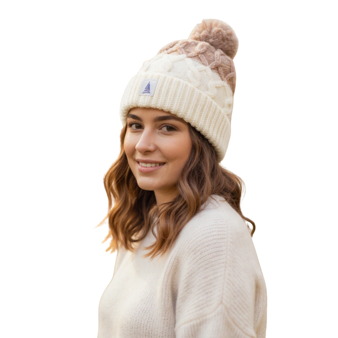 Ciepła czapka damska z grubym splotem i pomponem z naszywką Captain Mike