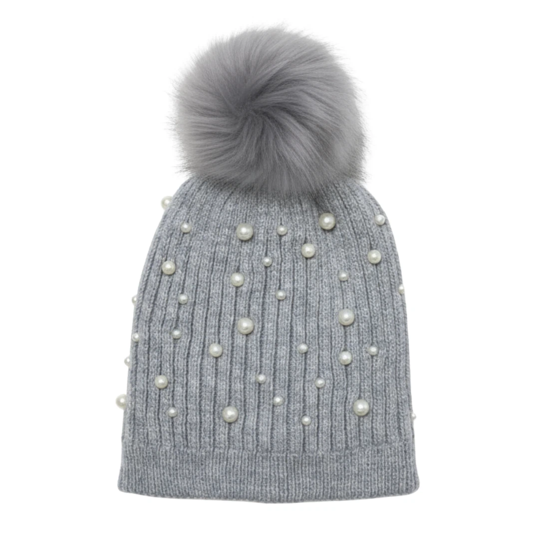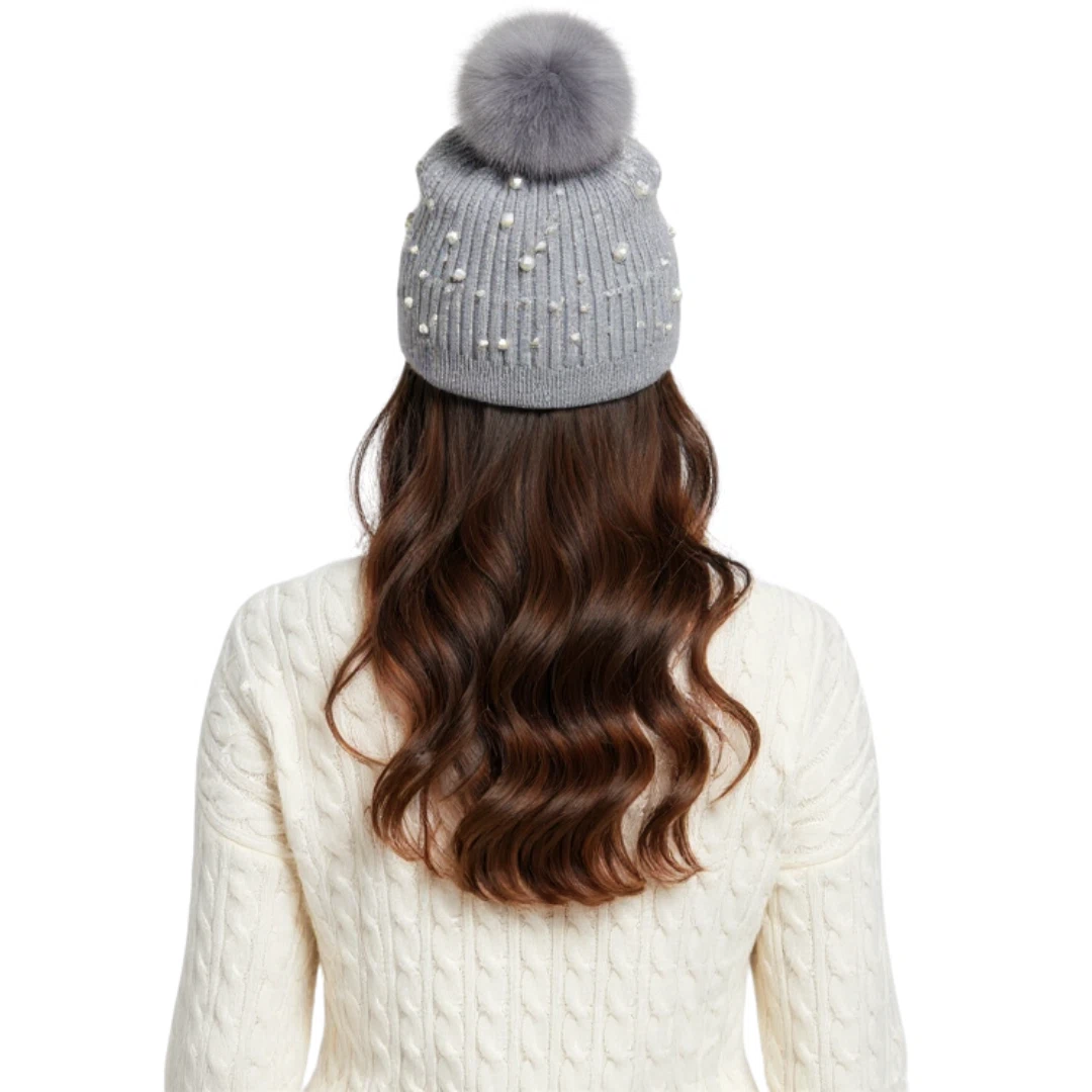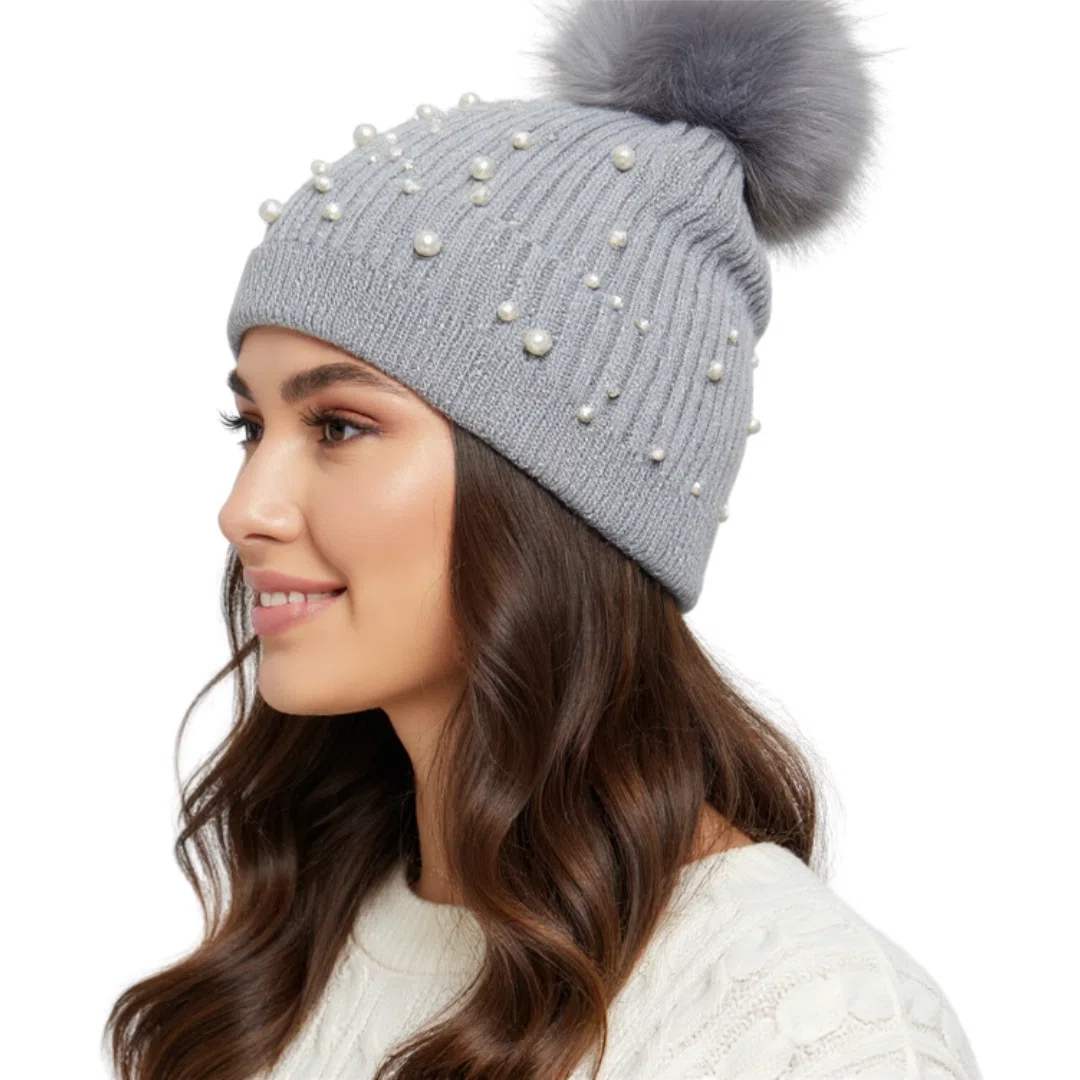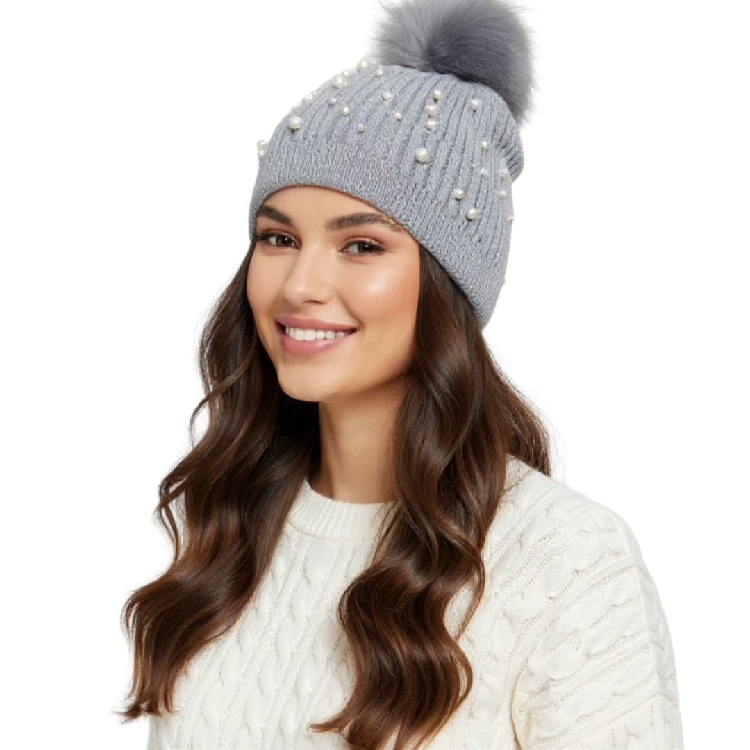 Szara czapka zimowa z perełkami i pomponem – elegancja i ciepło w jednym!