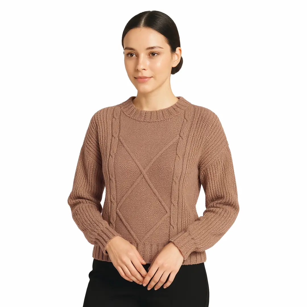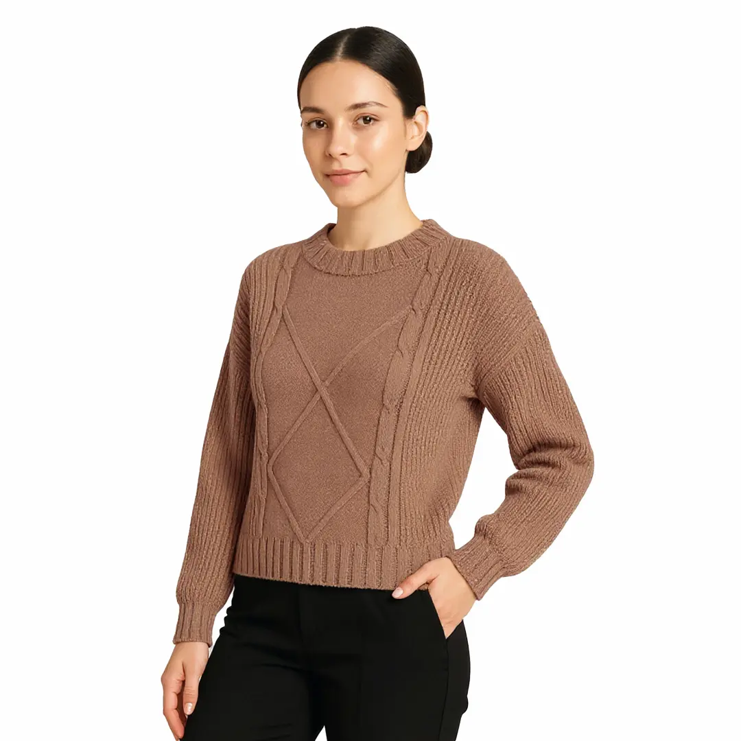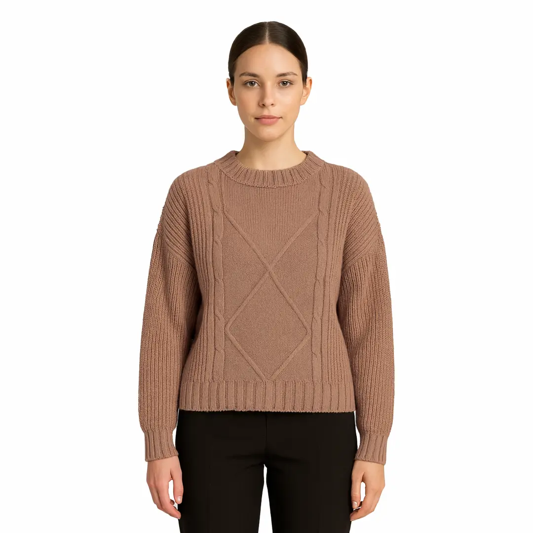 Sweter damski beżowy ciepły warkoczowy splot klasyczny dekolt okrągły elegancki Captain Mike.