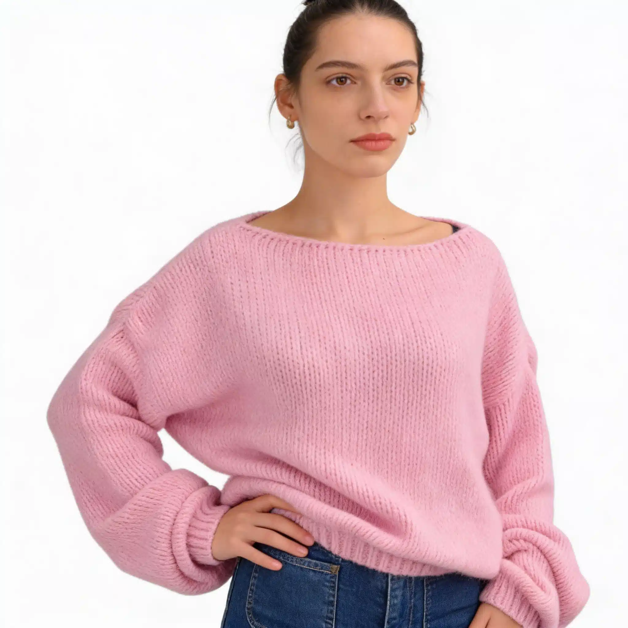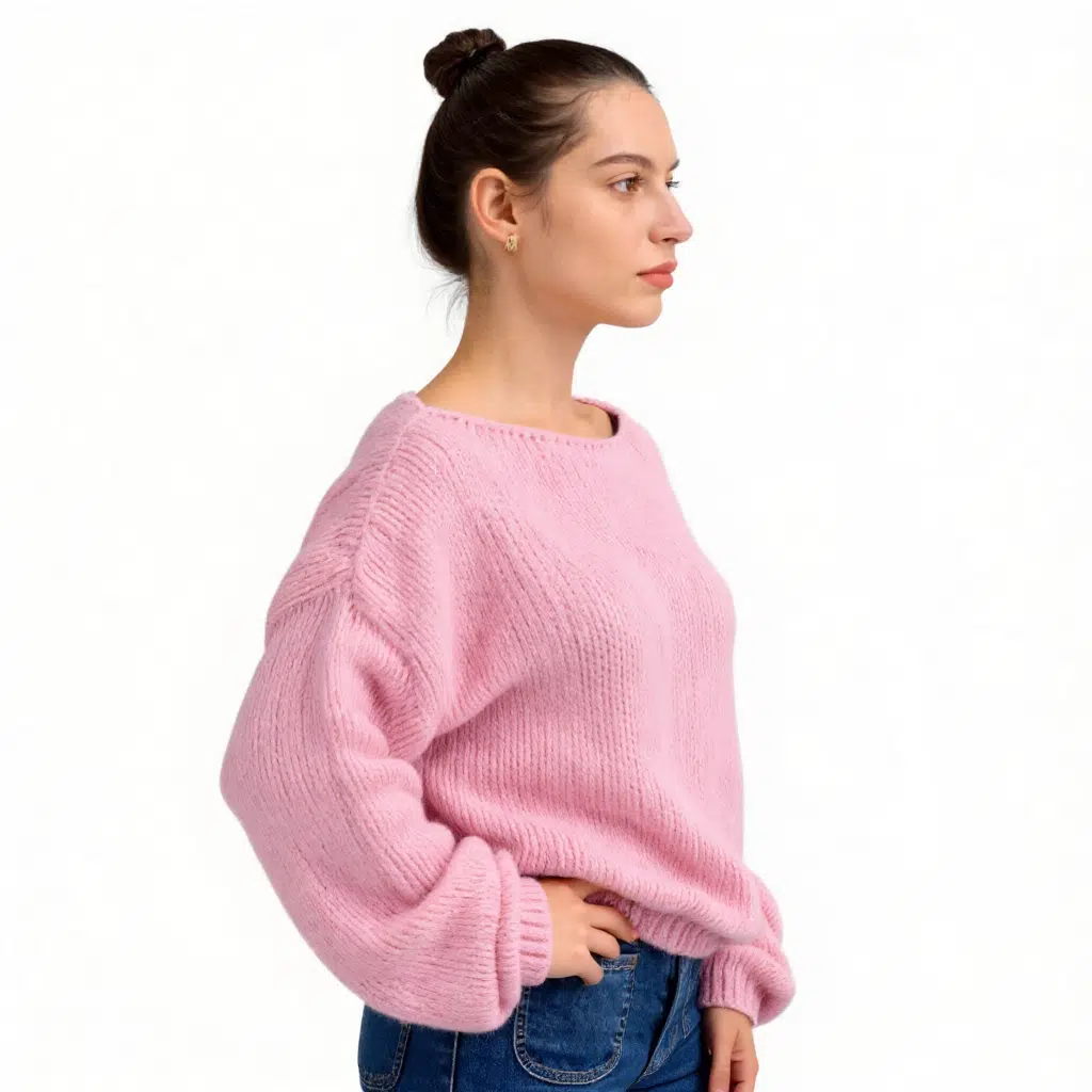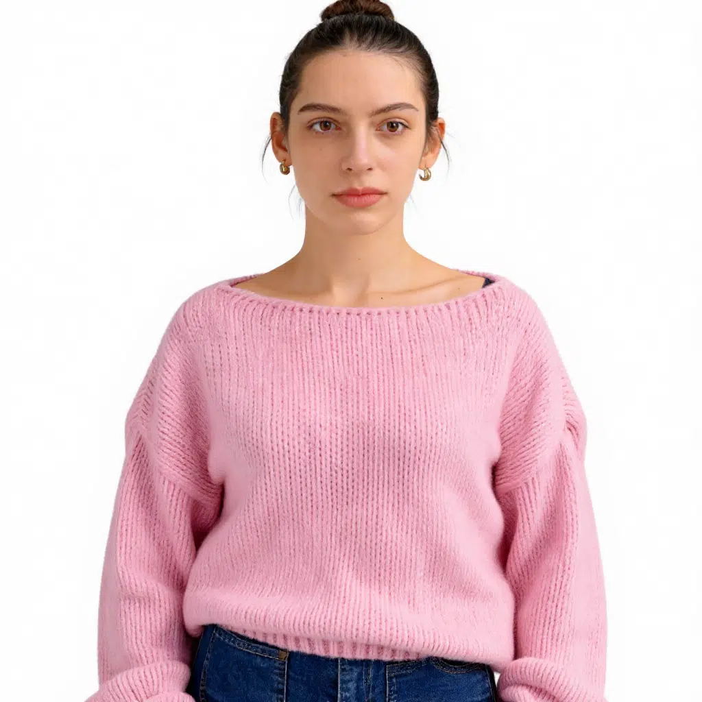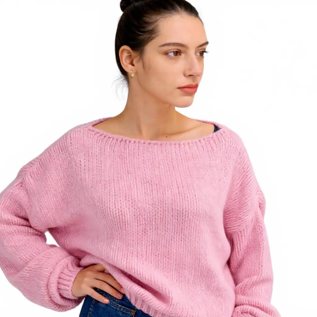 Ciepły sweter damski różowy oversize miękki elegancki, klasyczny dekolt Captain Mike