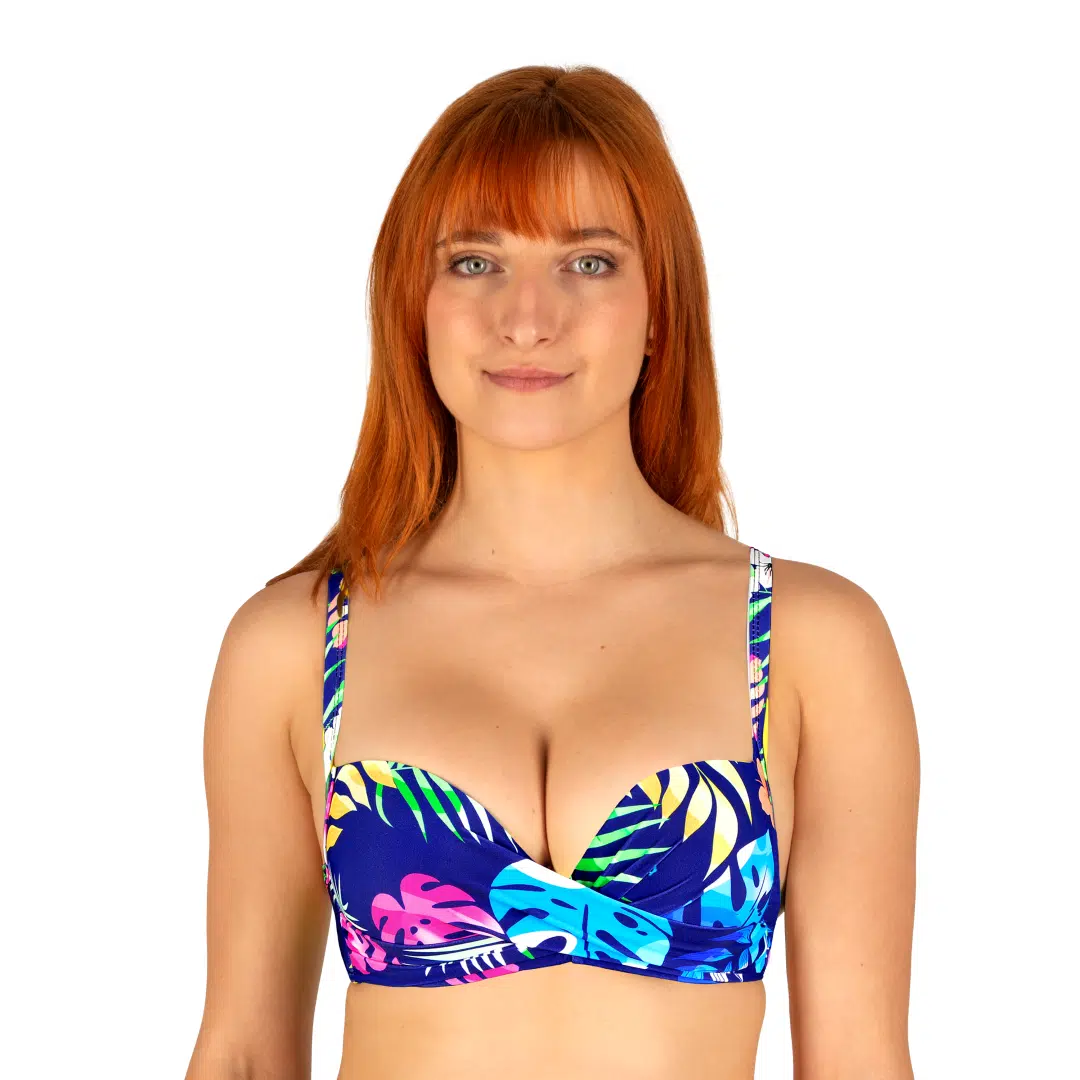 Pozwól sobie na odrobinę egzotyki – ten dwuczęściowy strój kąpielowy to must-have tego lata! Wyrazisty print z liśćmi monstery i kwiatami w intensywnych, wakacyjnych kolorach przyciąga spojrzenia i dodaje energii każdej stylizacji plażowej. Usztywniany biustonosz z fiszbinami pięknie modeluje biust, zapewniając komfort i wsparcie przez cały dzień. Regulowane ramiączka pozwolą Ci dopasować go idealnie do swojej sylwetki, a figi z subtelnym wiązaniem po bokach dodają całości kobiecego uroku i lekkości.