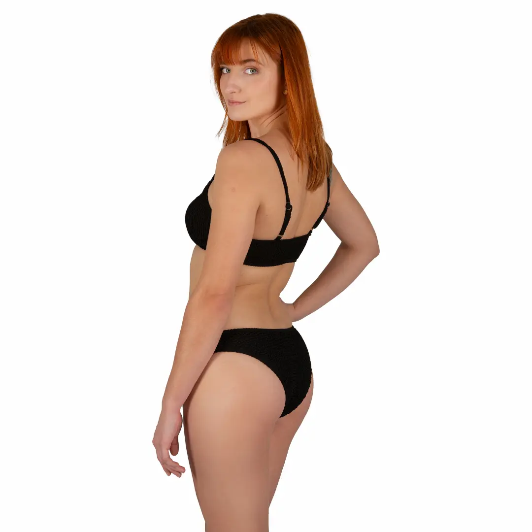 Góra od dwuczęściowego stroju kąpielowego damskiego – czarny komplet z marszczonego materiału.