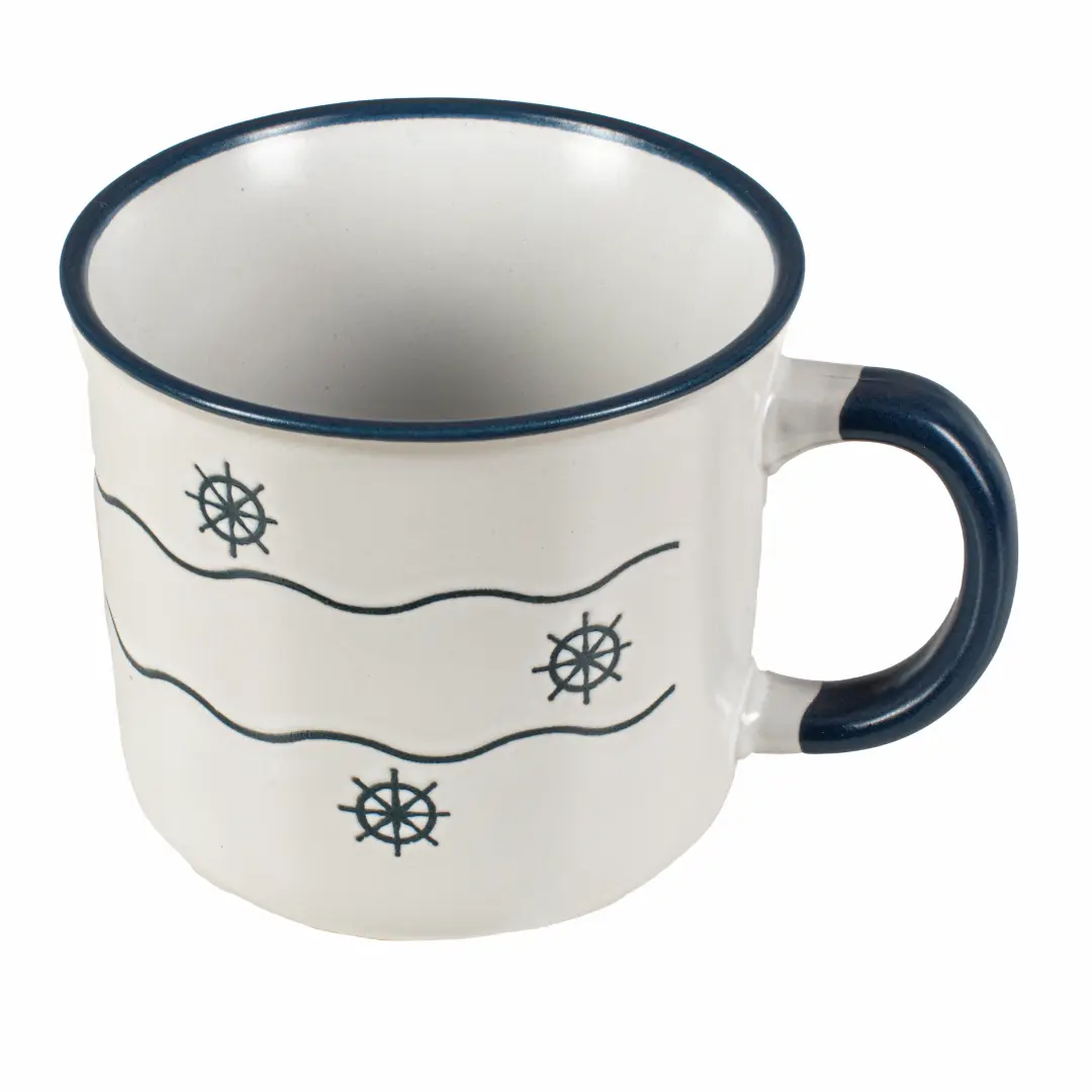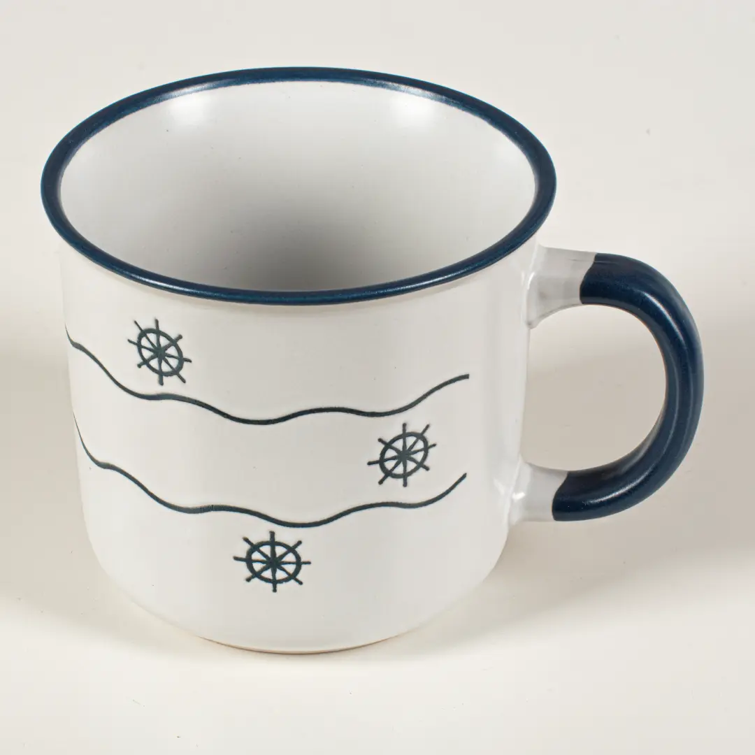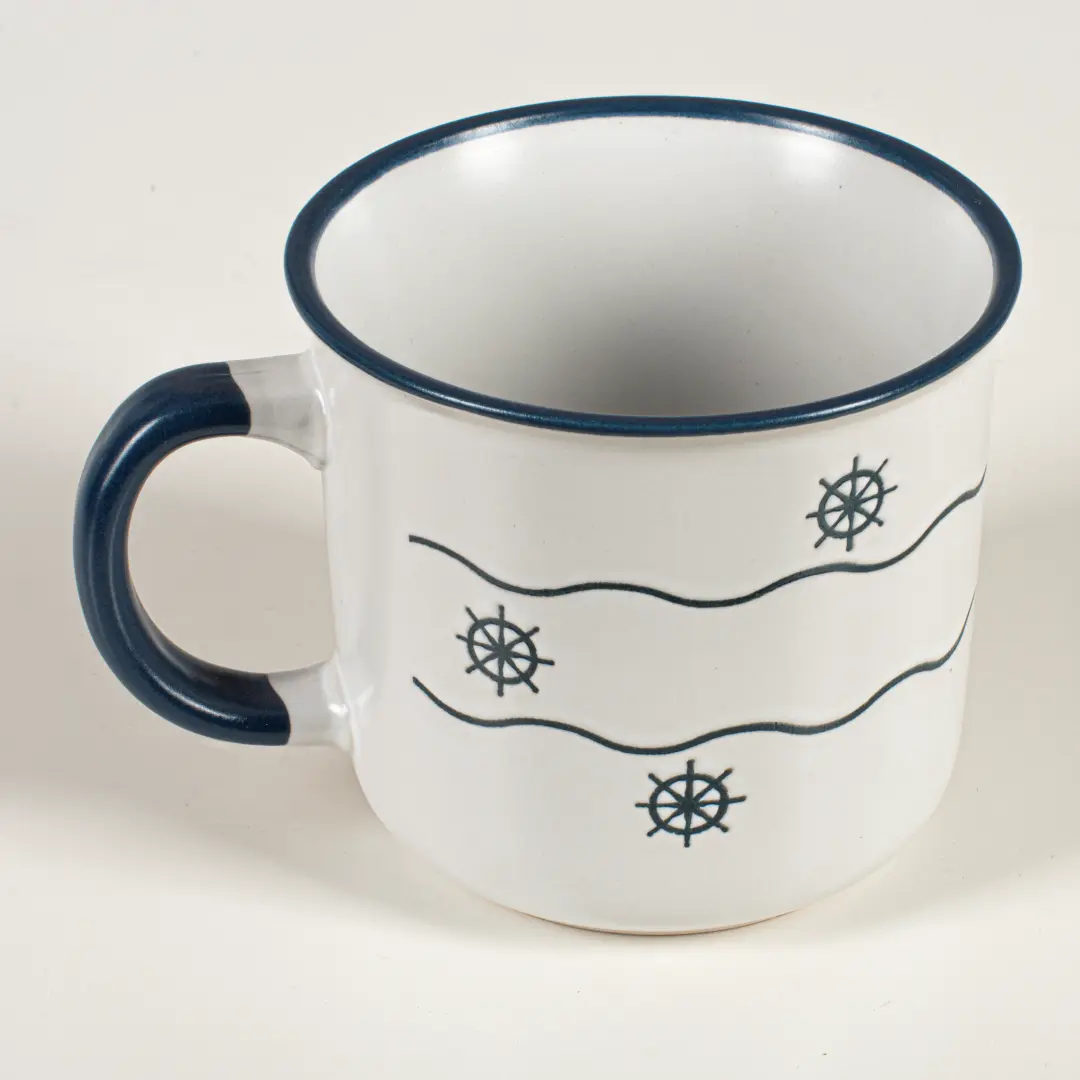 Elegancki kubek wykonany z wysokiej jakości kamionki, idealny na kawę, herbatę czy inne ulubione napoje. Powierzchnia pokryta jest granatowym szkliwem z dekoracyjnym wzorem koła sterowego i fal, co nadaje mu wyjątkowy morski charakter. Solidne ucho zapewnia wygodę użytkowania, a trwała kamionka gwarantuje długą żywotność naczynia.
