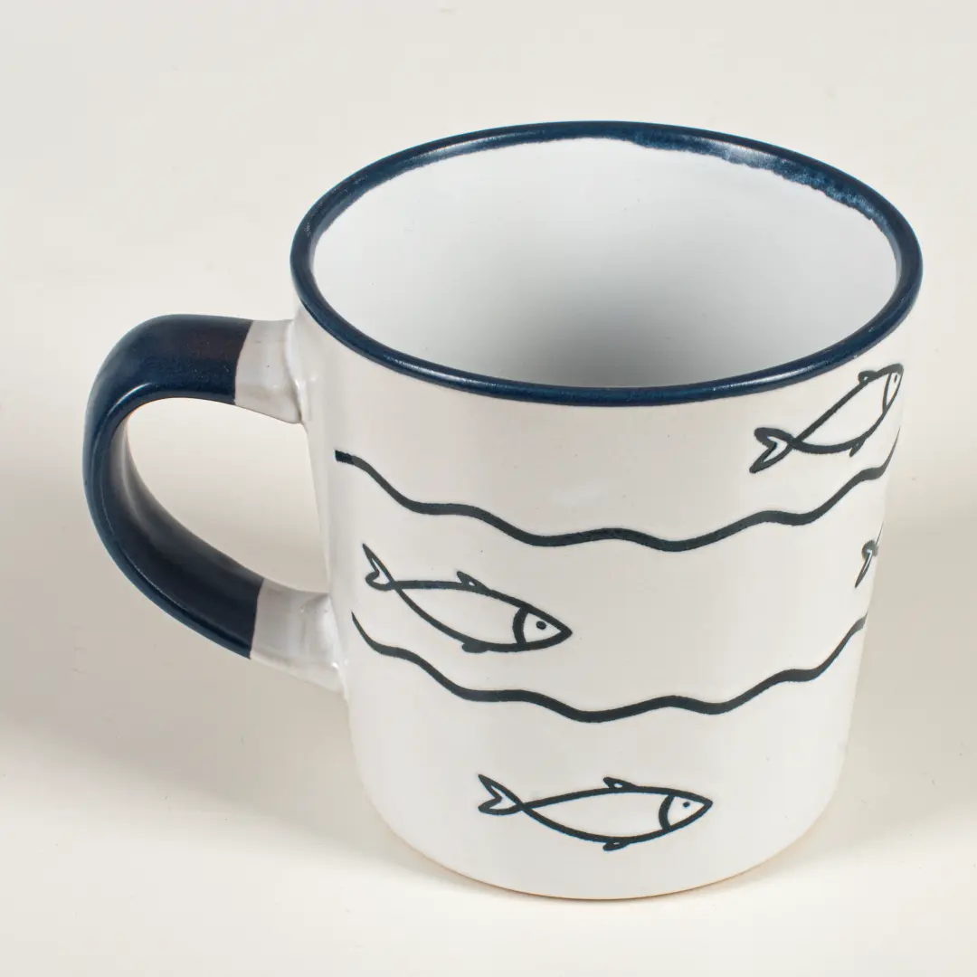 Elegancki kubek wykonany z wysokiej jakości kamionki, idealny na kawę, herbatę czy inne ulubione napoje. Powierzchnia pokryta jest granatowym szkliwem z dekoracyjnym wzorem rybek i fal, co nadaje mu wyjątkowy morski charakter. Solidne ucho zapewnia wygodę użytkowania, a trwała kamionka gwarantuje długą żywotność naczynia.