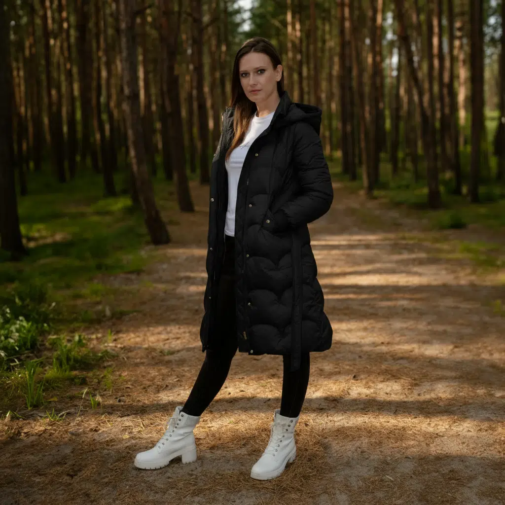 - Wodoodporność i wiatroszczelność: Dzięki zastosowaniu zewnętrznej powłoki z nylonu, nasza kurtka chroni przed deszczem, śniegiem i wiatrem