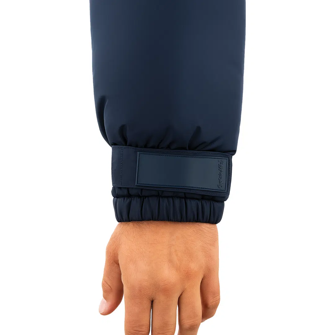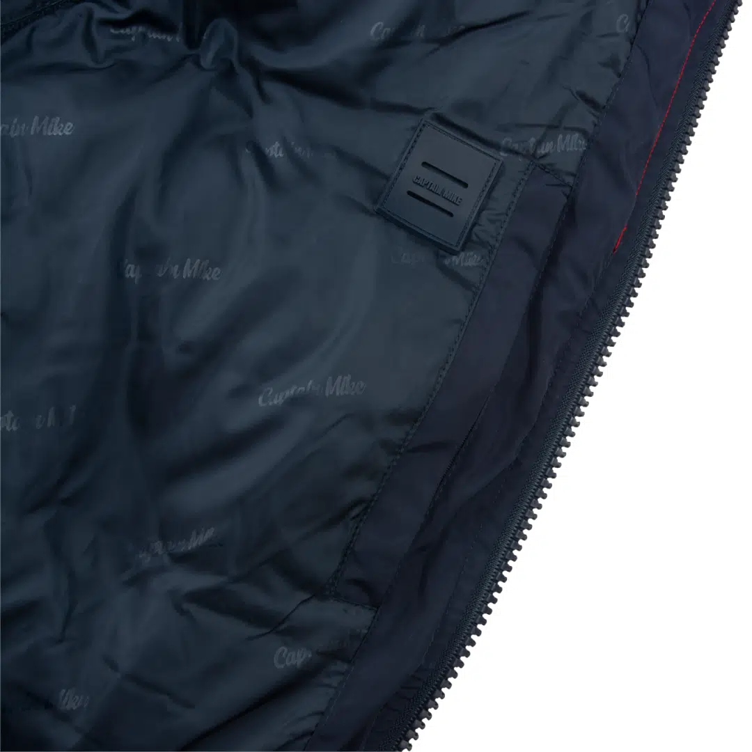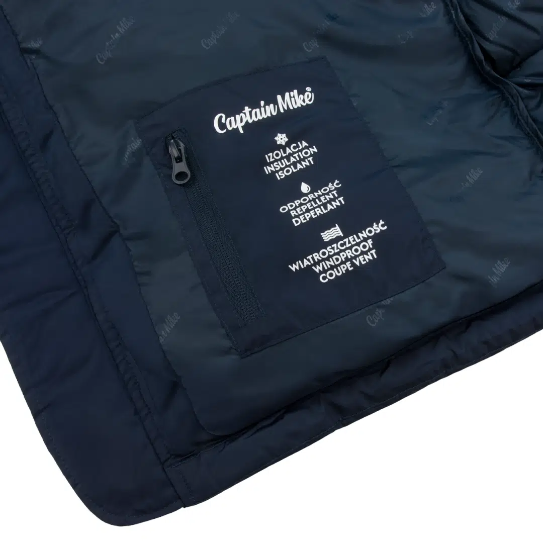 Wnętrze kurtki wykończone jest elegancką podszewką z powtarzającym się nadrukiem Captain Mike, co podkreśla jej markowy charakter. Na wewnętrznym panelu umieszczono także oznaczenia najważniejszych cech kurtki:
