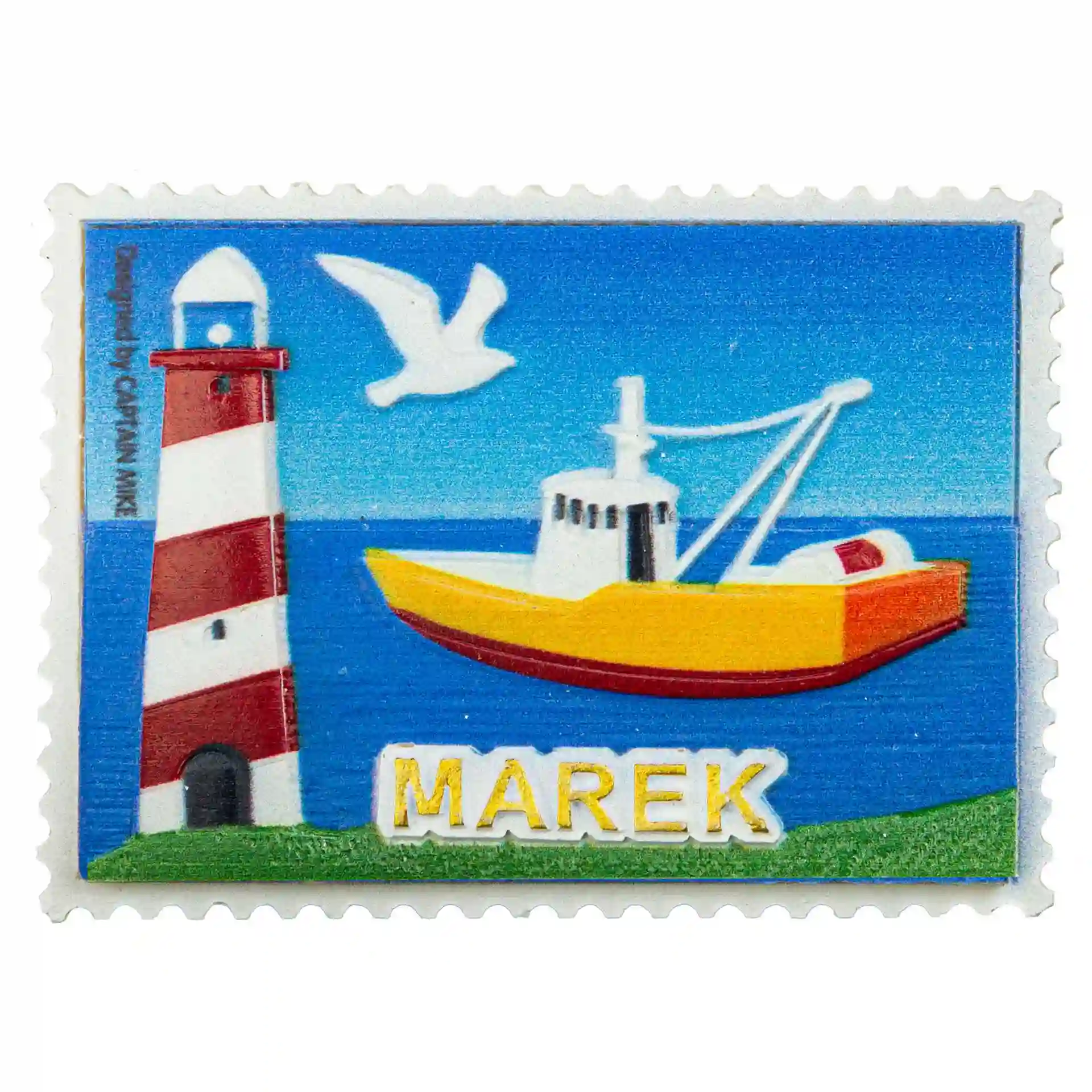 Magnes imiennym w kształcie znaczka pocztowego MAREK Captain Mike.