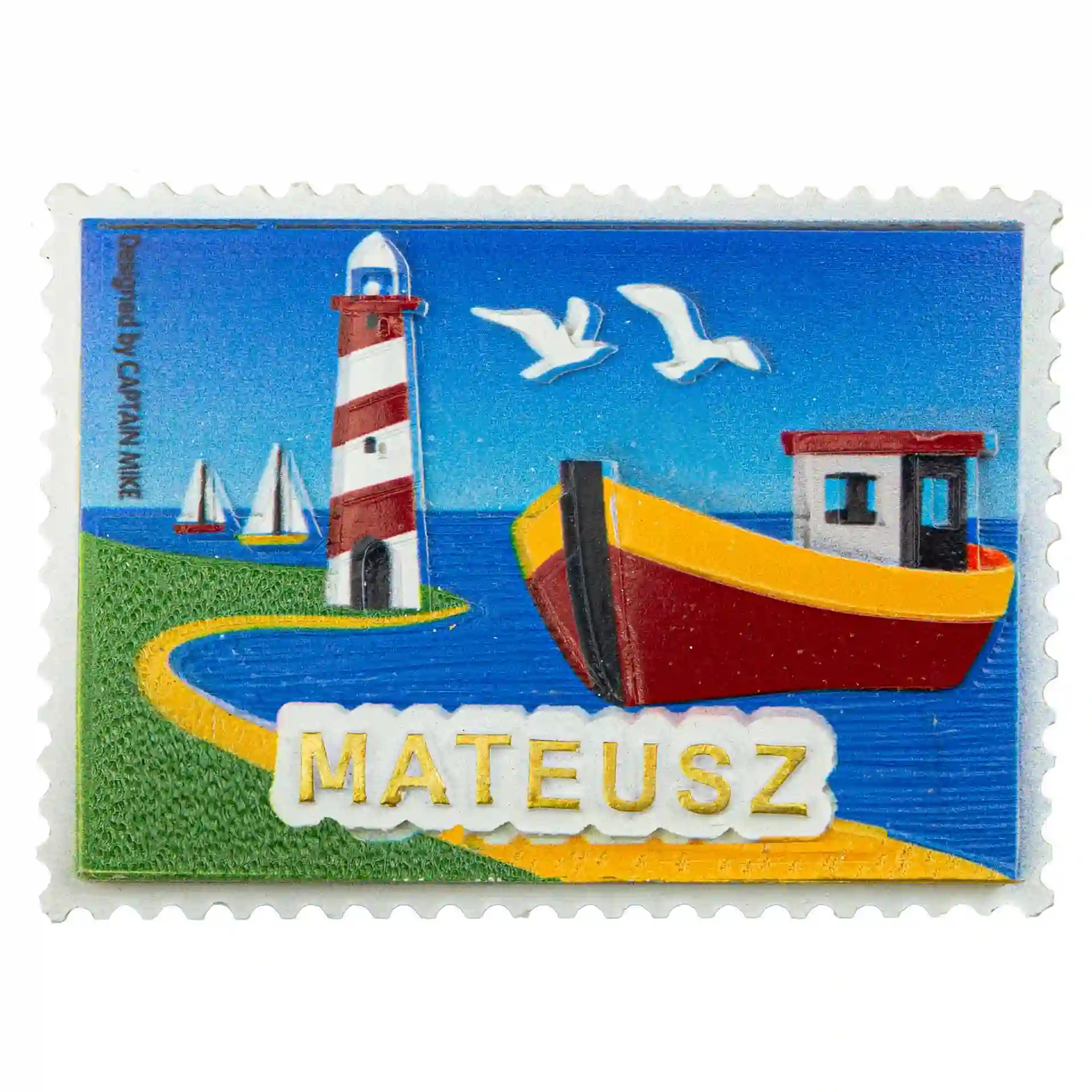 Magnes imiennym MATEUSZ w kształcie znaczka pocztowego Captain Mike.