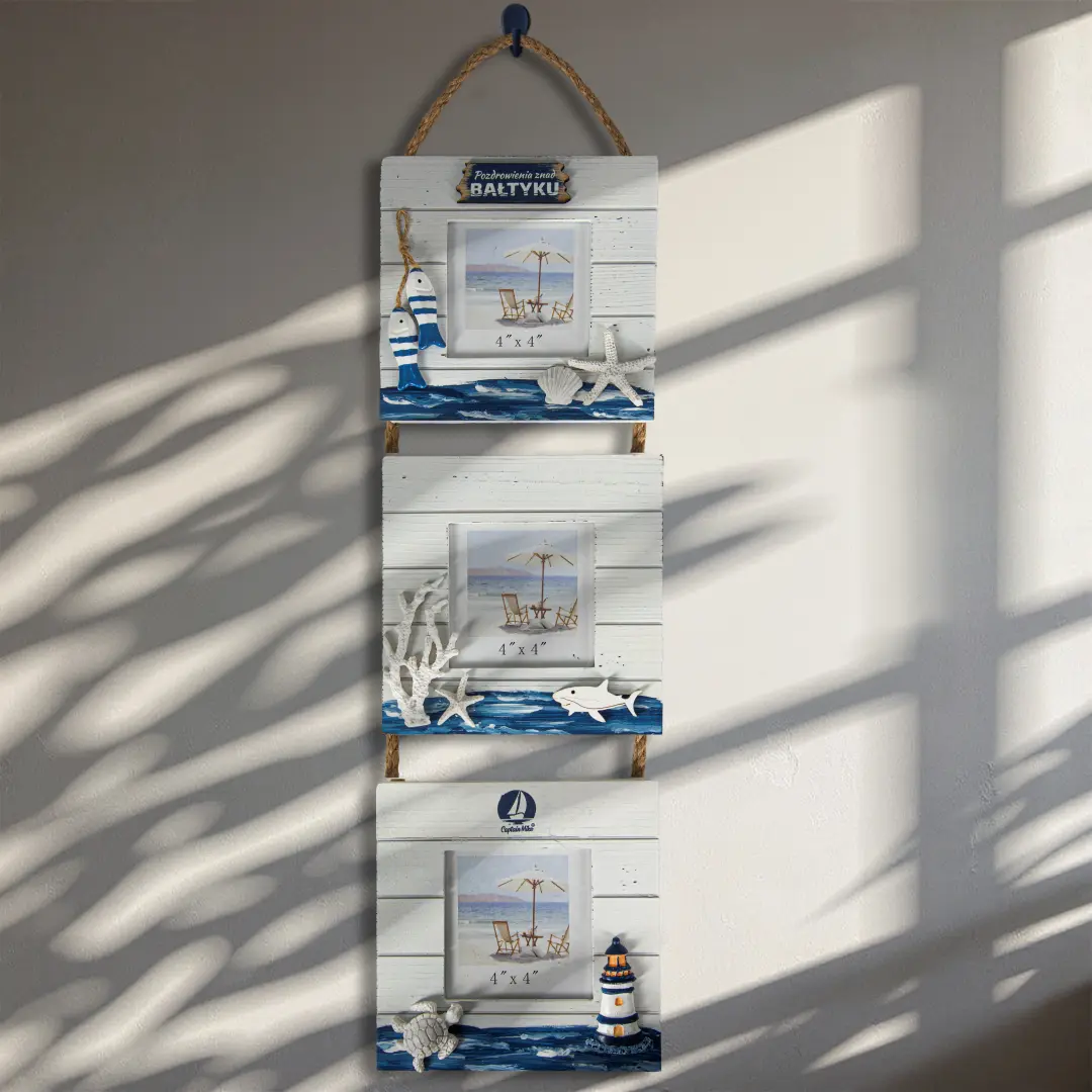 Zestaw trzech ozdobnych ramek do zdjęć to idealna propozycja dla miłośników nadmorskich wspomnień. Każda z nich utrzymana jest w stylu marynistycznym, z napisem „Pozdrowienia znad Bałtyku”, co czyni je wyjątkową dekoracją dla domków letniskowych, nadmorskich apartamentów lub każdego wnętrza, które chcesz wypełnić wakacyjną atmosferą.