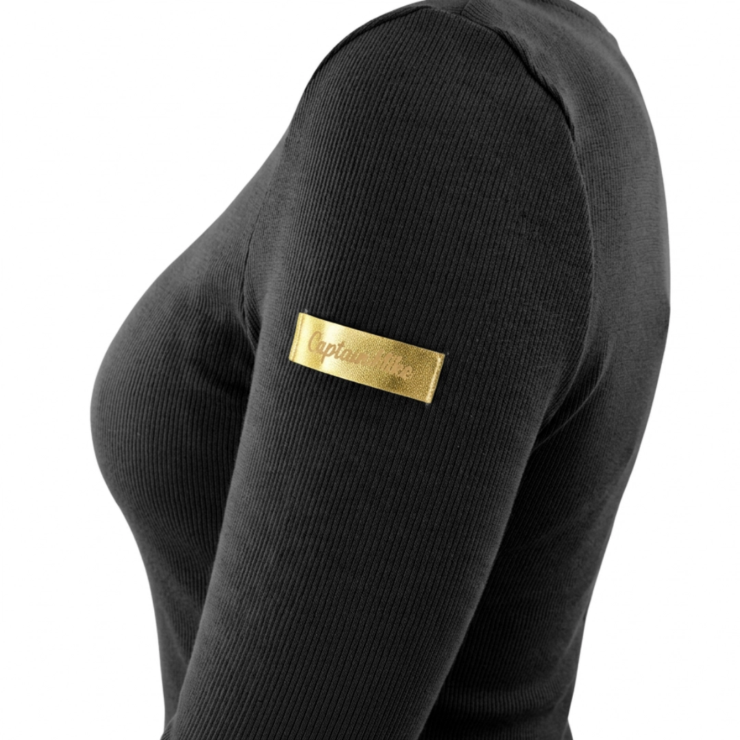 Dopasowana czarna sukienka damska z długim rękawem i długością do kolan. Kobiecy fason podkreśla sylwetkę i sprawdzi się na każdą okazję!