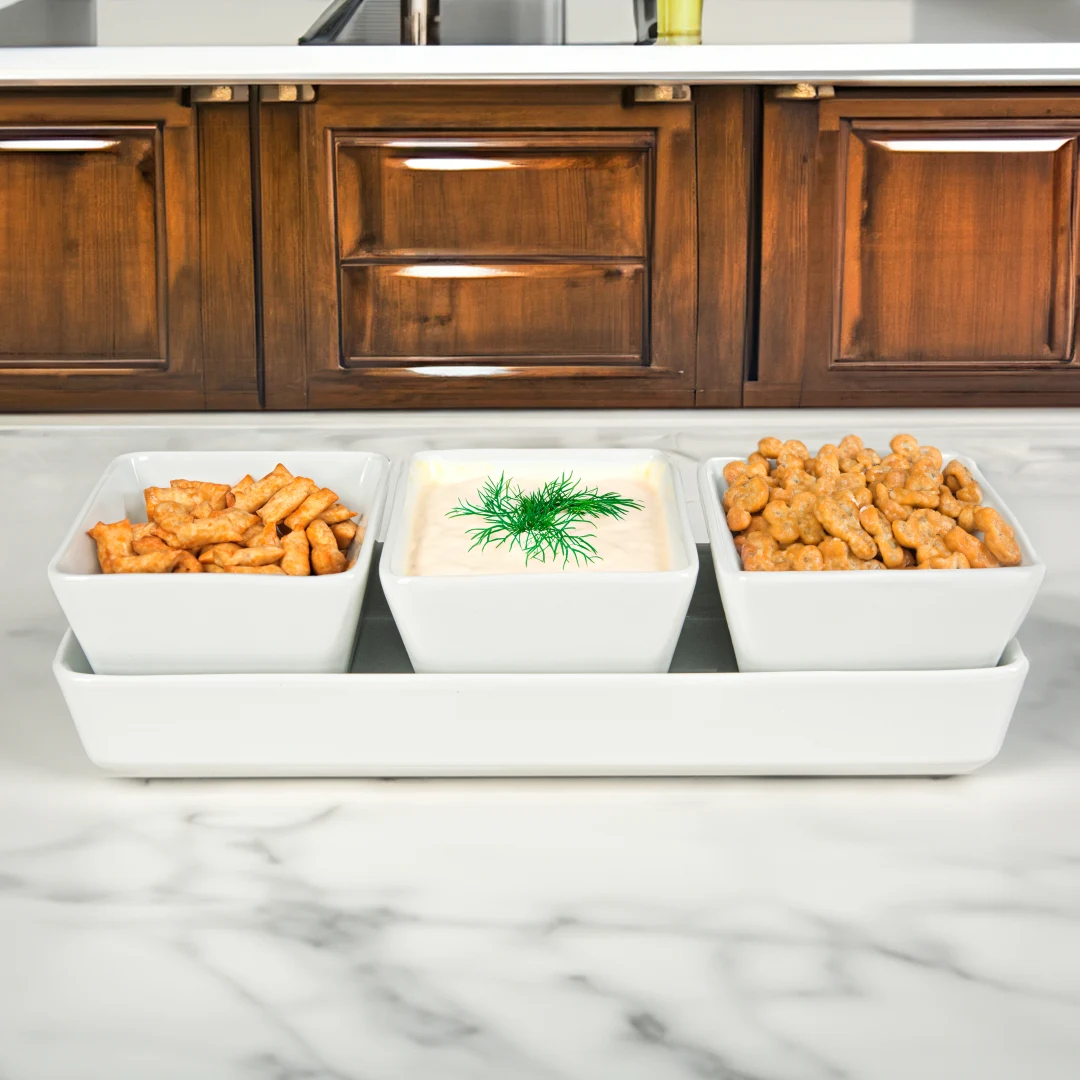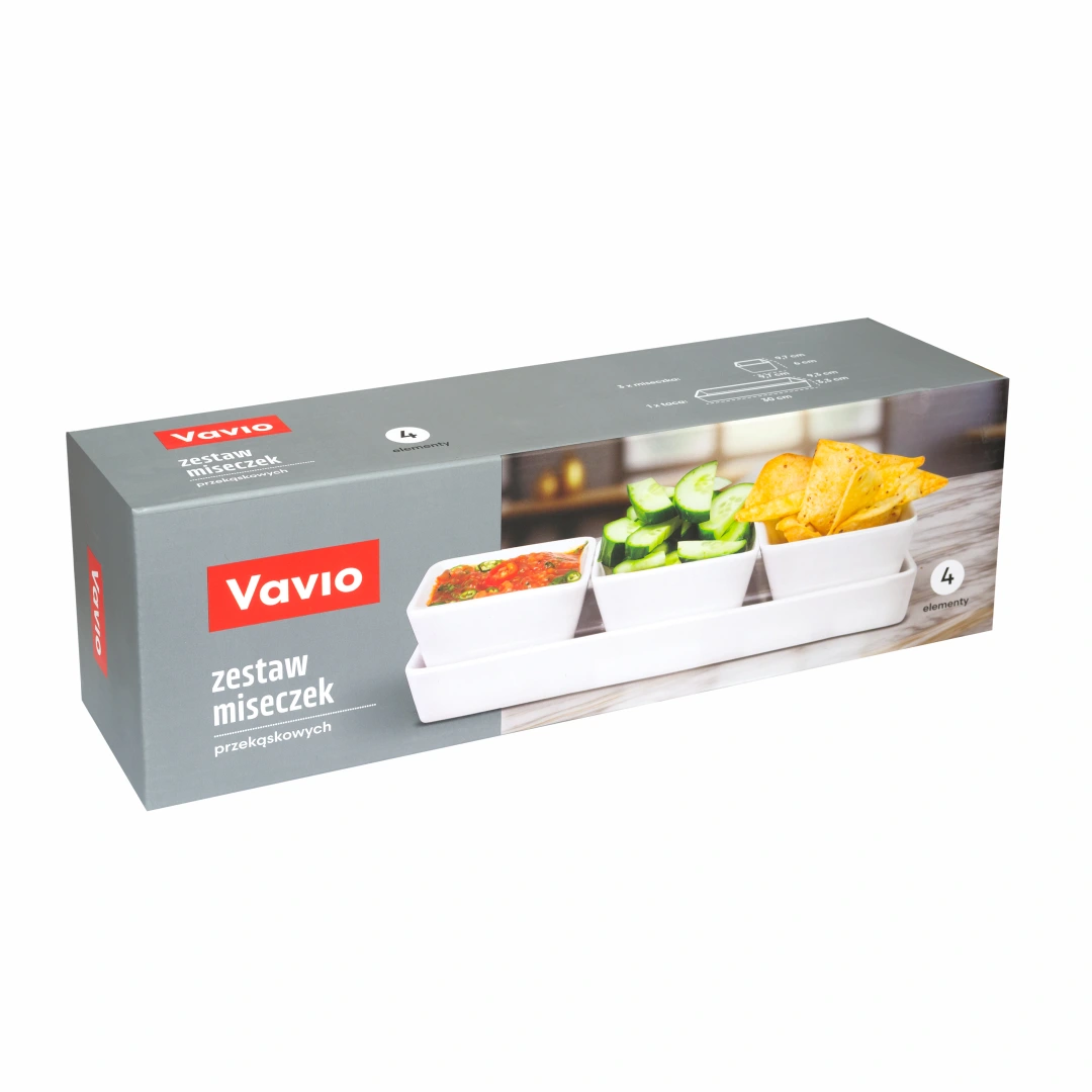 - 3 miseczki + taca – kompletny zestaw do serwowania różnych przekąsek
