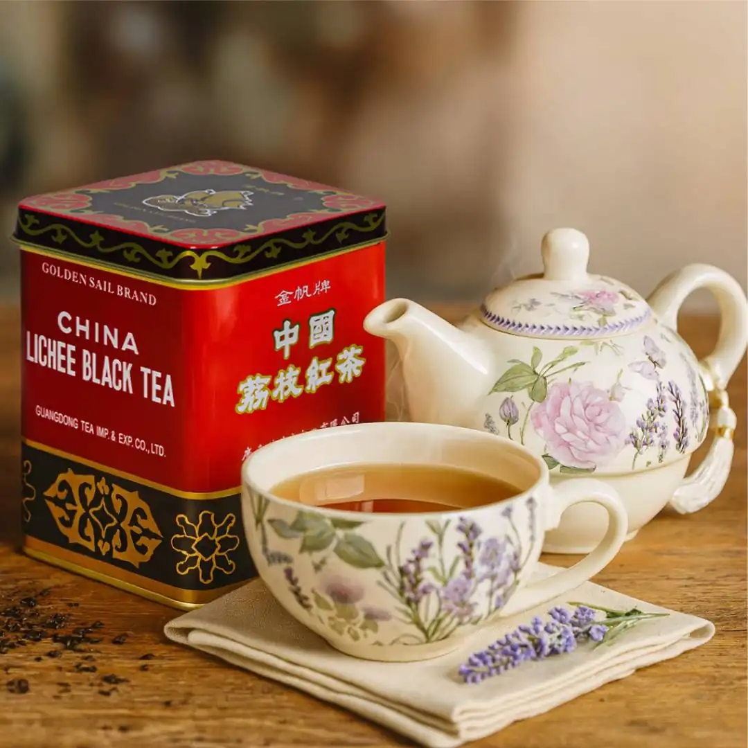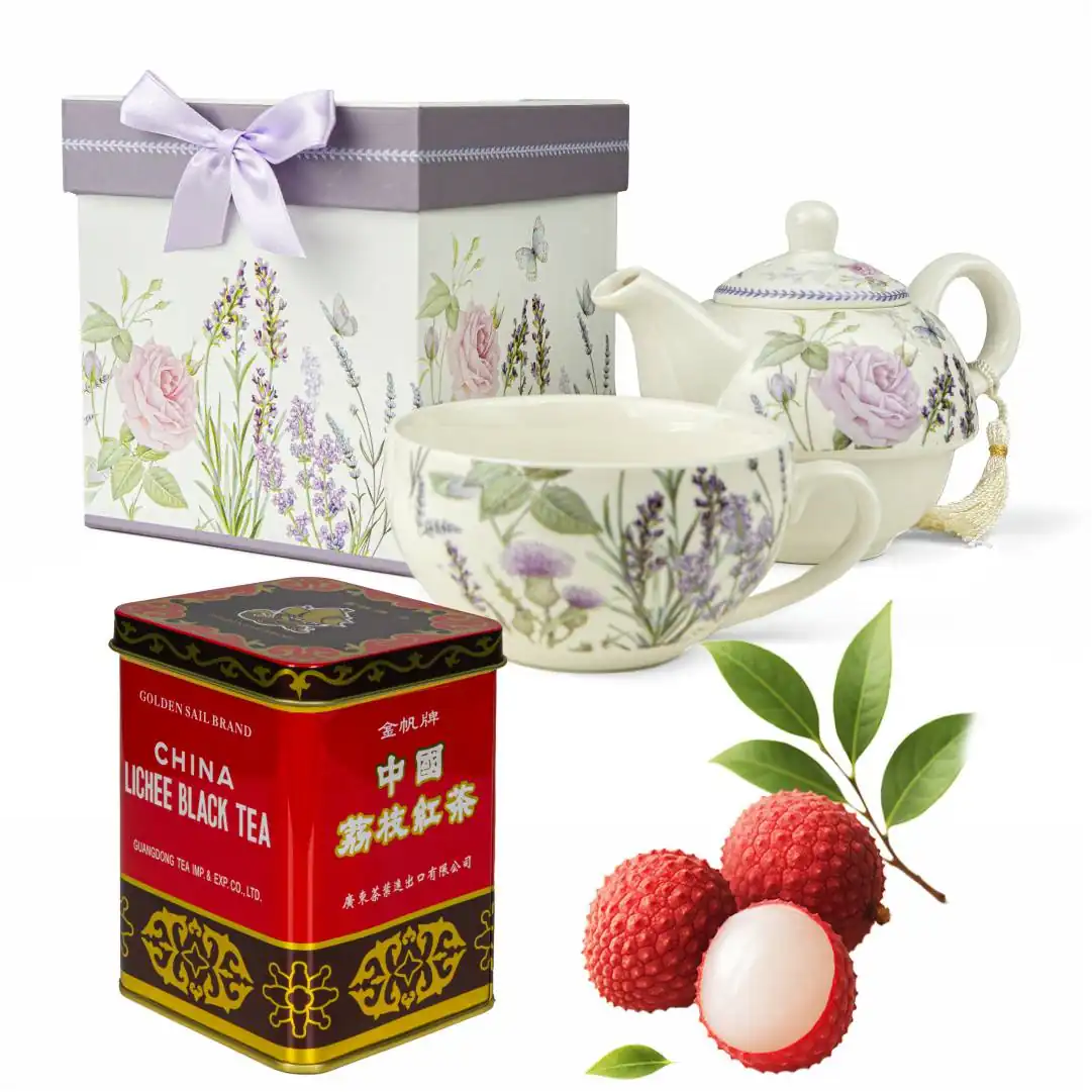 Elegancki zestaw prezentowy – porcelanowy czajniczek z filiżanką + herbata czarna z liczi.
