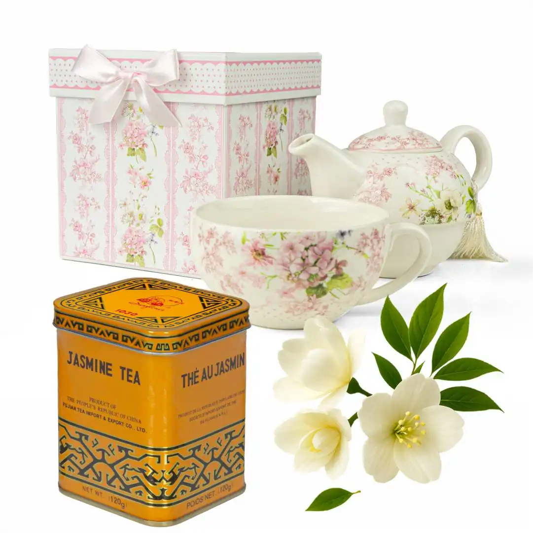 Elegancki zestaw prezentowy - porcelanowy czajniczek z filiżanką + herbata jaśminowa.